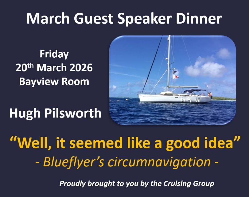For our March Guest Speaker (Friday March 20th), we have SYC and QCYC member, Hugh Pilsworth who will present on… Read more: Cruising News 10/3 - Footy Tipping Wk 1