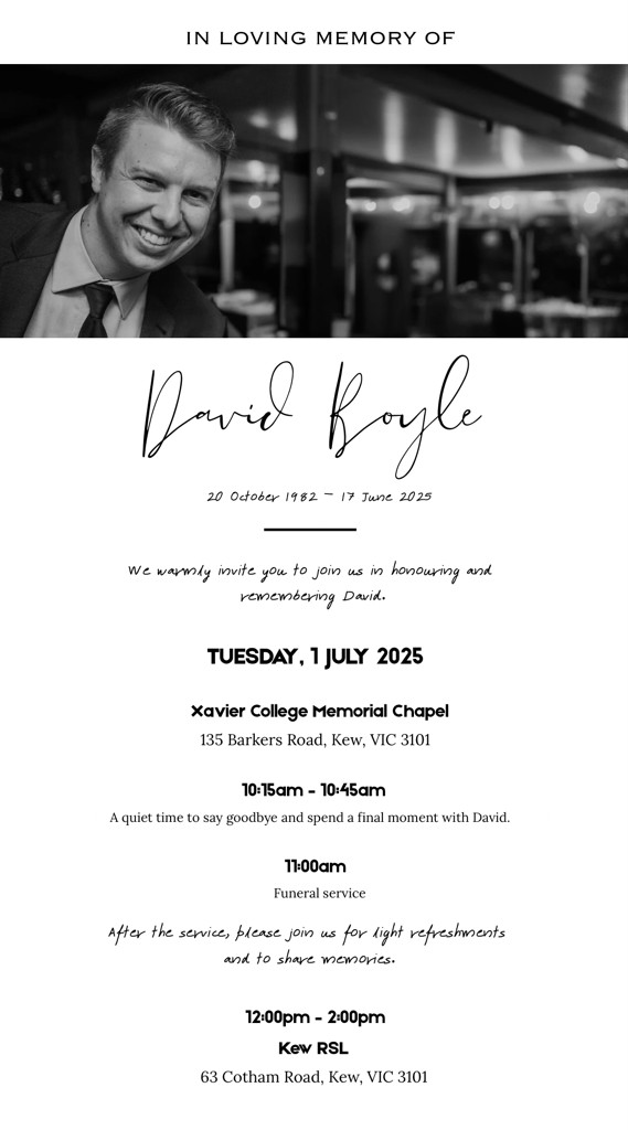 RBYC member Brendan Boyle has let us know that his son David died of melanoma recently. David started Sailing as a junior 36 years ago and competed in state and nationals for RBYC for well over 10 years and sailed on Brendan's yachts and many other RBYC yachts locally and national all his life. Recently he sailed and steered on Jaffa with Andrew Neeson over the last 5 years. David was also actively a Javelin skiff sailor on a local and national basis. Details of the Memorial service for David are here.