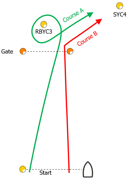 An example of the difference was highlighted in a recent ORCV Winter Series race where the course was Start, Gate, RBYC3, SYC4 and each were designated as rounding marks. In the diagram below the correct course to sail according to the rules is the green Course A. The red course is what most boats sailed, but it doesn’t meet the string test as a “string pulled taut” does not touch RBYC3. Clearly this was an error in the Sis as the intention was not to have a fleet of 40 keelboats all doing a 270 degree turn around RBYC3.