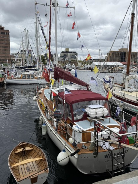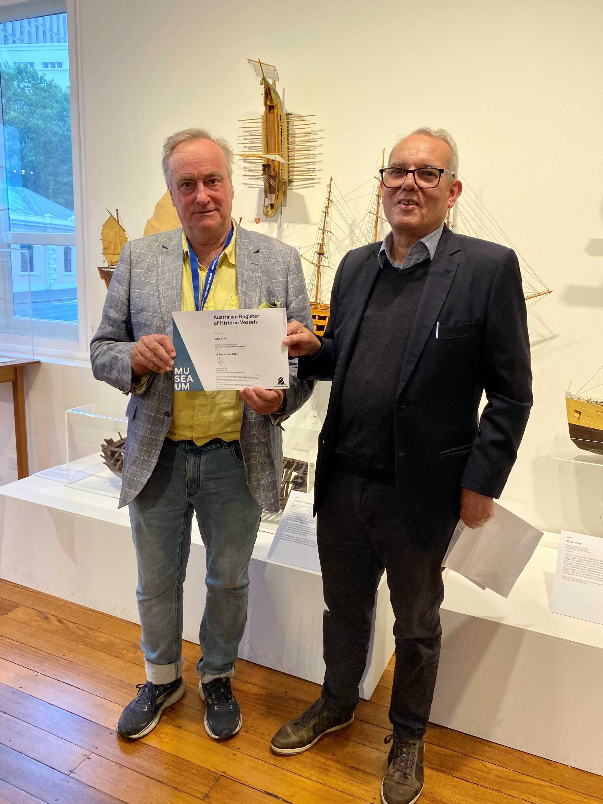 At the 20 June Cruising Group dinner John Rundell, owner of the beautiful wooden boat Why Knot entertained us with tales of his voyage to Hobart to attend the 2025 Wooden Boat Festival. While on that trip, Why Knot had the honour of being added to the Australian Register of Historic Vessels. Why Knot is a Salar 40 design built in 1972 OF King Billy Pine by Barry Wilson. The strip planked hull took 2000 hours to lay, with the complete built taking two years. John was presented with a certificate and burgee at the ARHV awards night. The photos show John at the ceremony and Why Knot at Elizabeth Wharf.