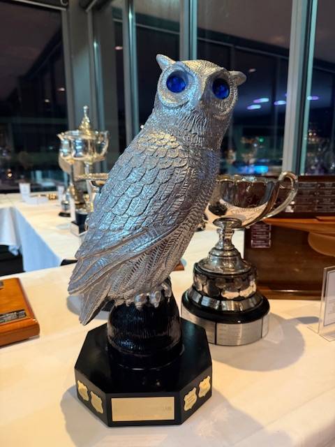 This trophy first appeared at the 150th anniversary presentation night in July 2025. It is awarded for the Dragon Long race and included retrospective winners of the trophy. The trophy is aptly named after Paul Wise, a frequent Dragon Sailor and the one who approved the rescue of the owl from the hardstand bin. The trophy was then given a base with plaques and is a testament to RBYC’s cleaner sailing commitments. The winner this season was Lyla 194, skippered by Maia Hester and crewed by Ruby Wise (Paul’s granddaughter) and James Harland. It was Ruby’s inaugural Dragon Race. James is the creative genius behind Wise Owls restoration.