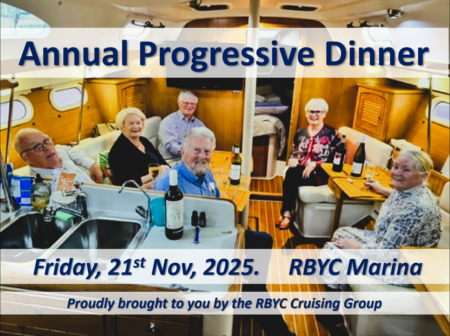 The 2025 annual Progressive Dinner will be held onFriday the 21st of November. ALL WELCOME, and not too late to book, be you a boat owner or non-boat owner, a racer, cruiser, aquatic or social member. This is always an excellent evening to get to know other club members, as the dinners are in small groups that change between the …